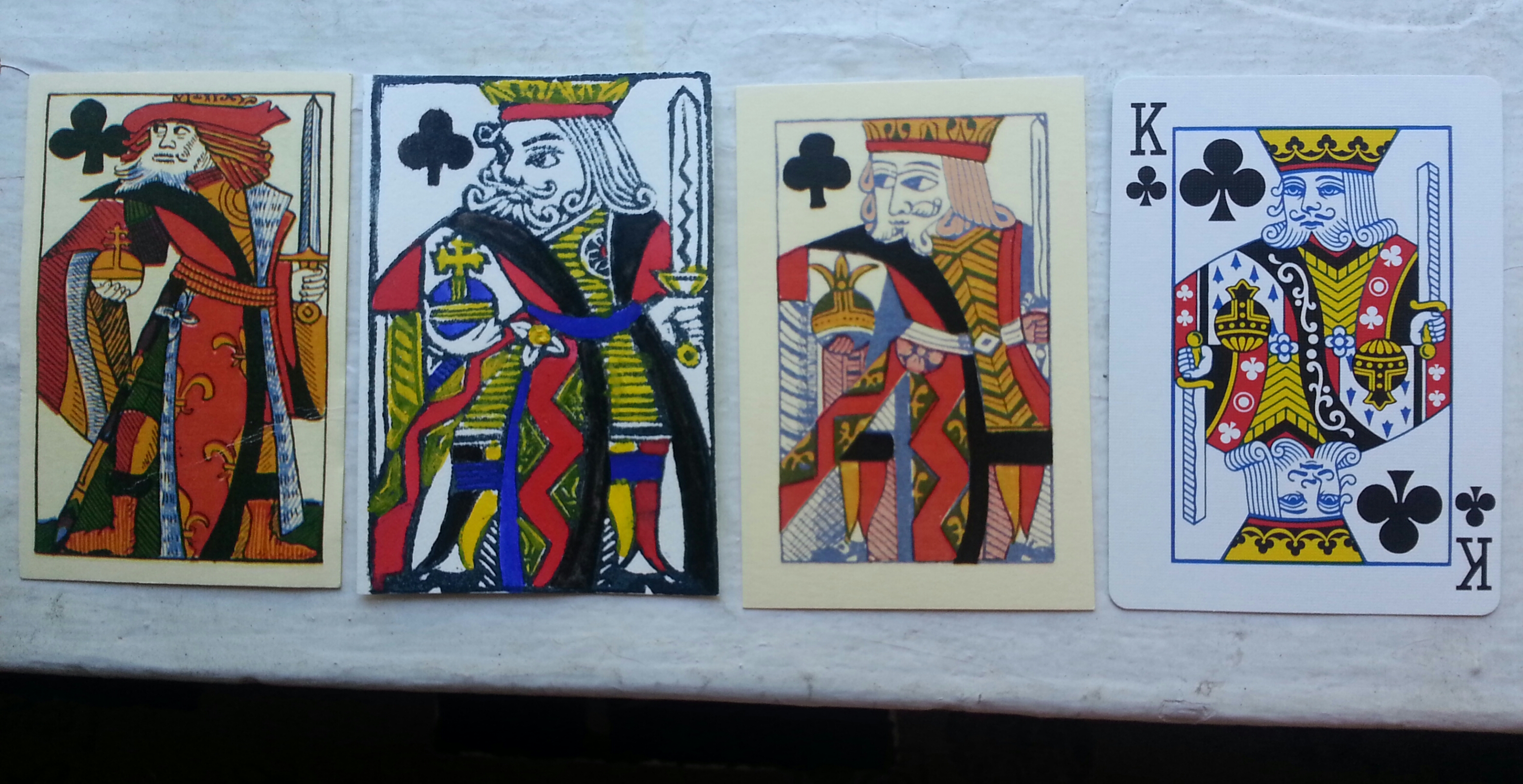 Notice that the pattern allows for design advancement (double headed, for example) but it appears the strongest influence for centuries is a sort of printer’s game of telephone, where subtle distortions caused by less skilled craftsmen who became further and further from the source material. It should be noted that the attire on some cards predates the earliest known examples by decades.