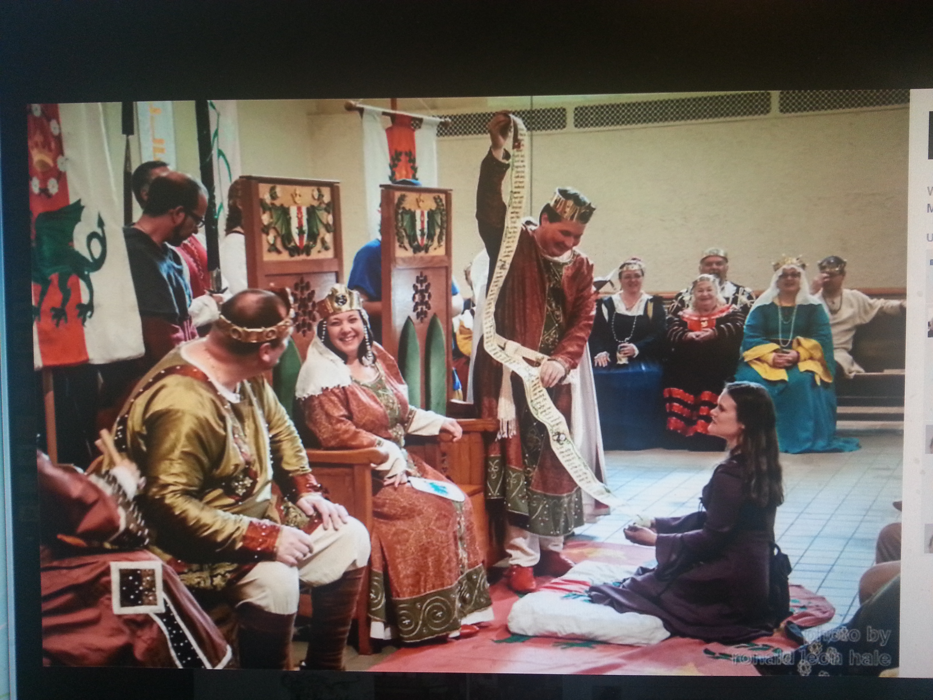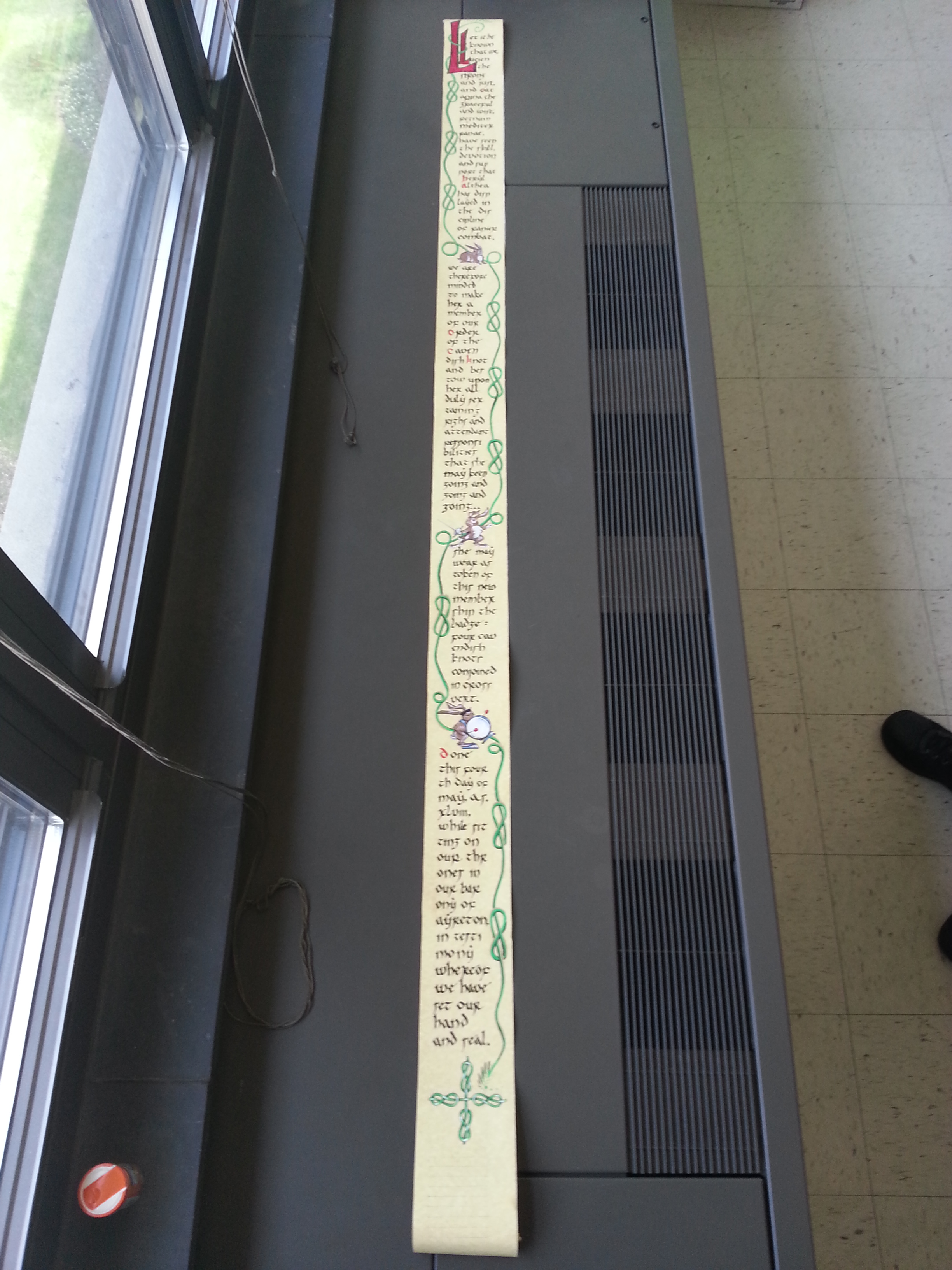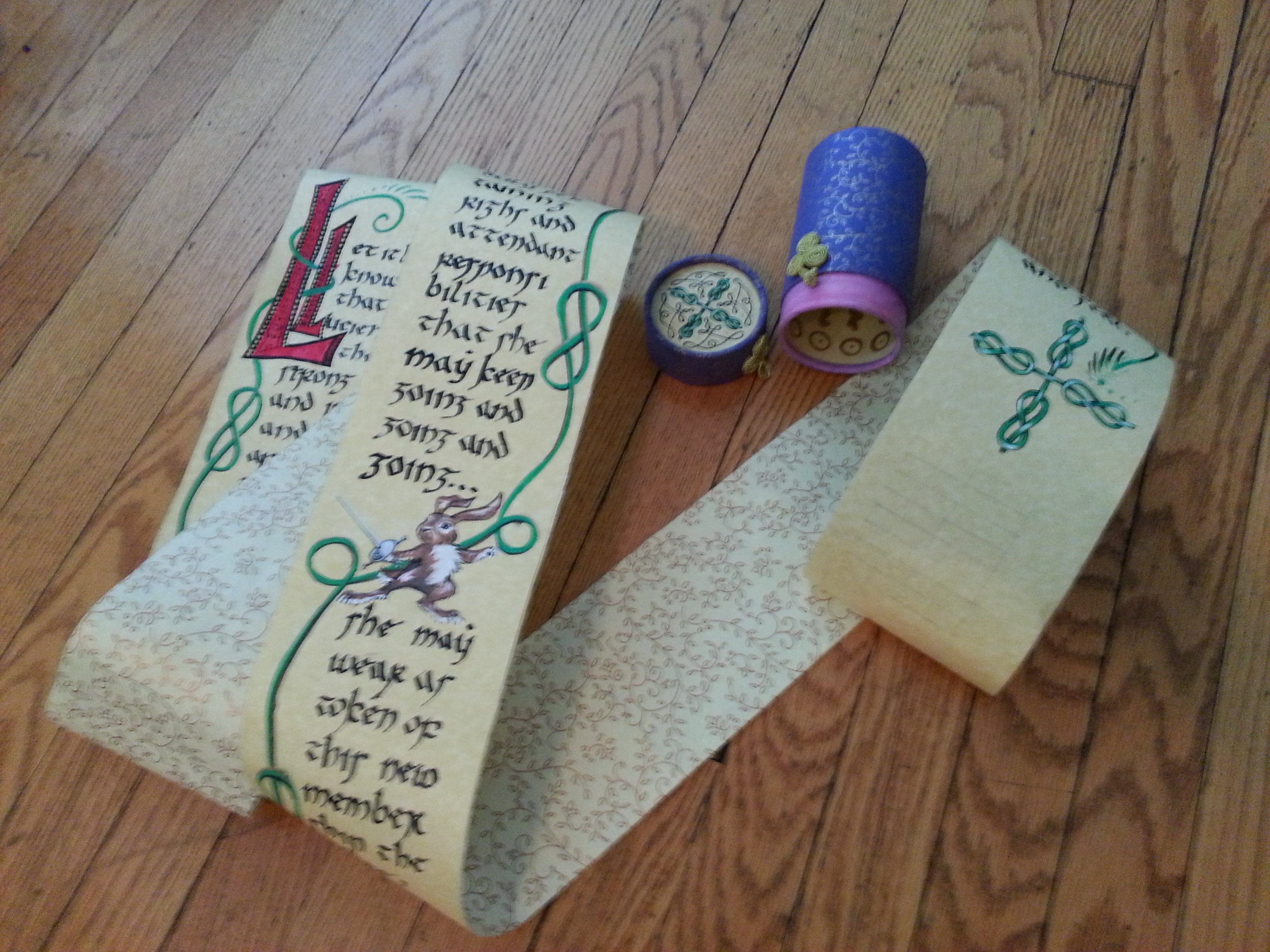 The signet saved this scroll assignment for me, hoping I would do something creative with it. The recipient had earned the nickname “Energizer Bunny” at practice, and it was implied that this should be incorporated into the scroll. I didn’t want a shades-and-blue-flip-flop wearing pink rabbit on a scroll, so instead, I made a scroll that keeps going and going…