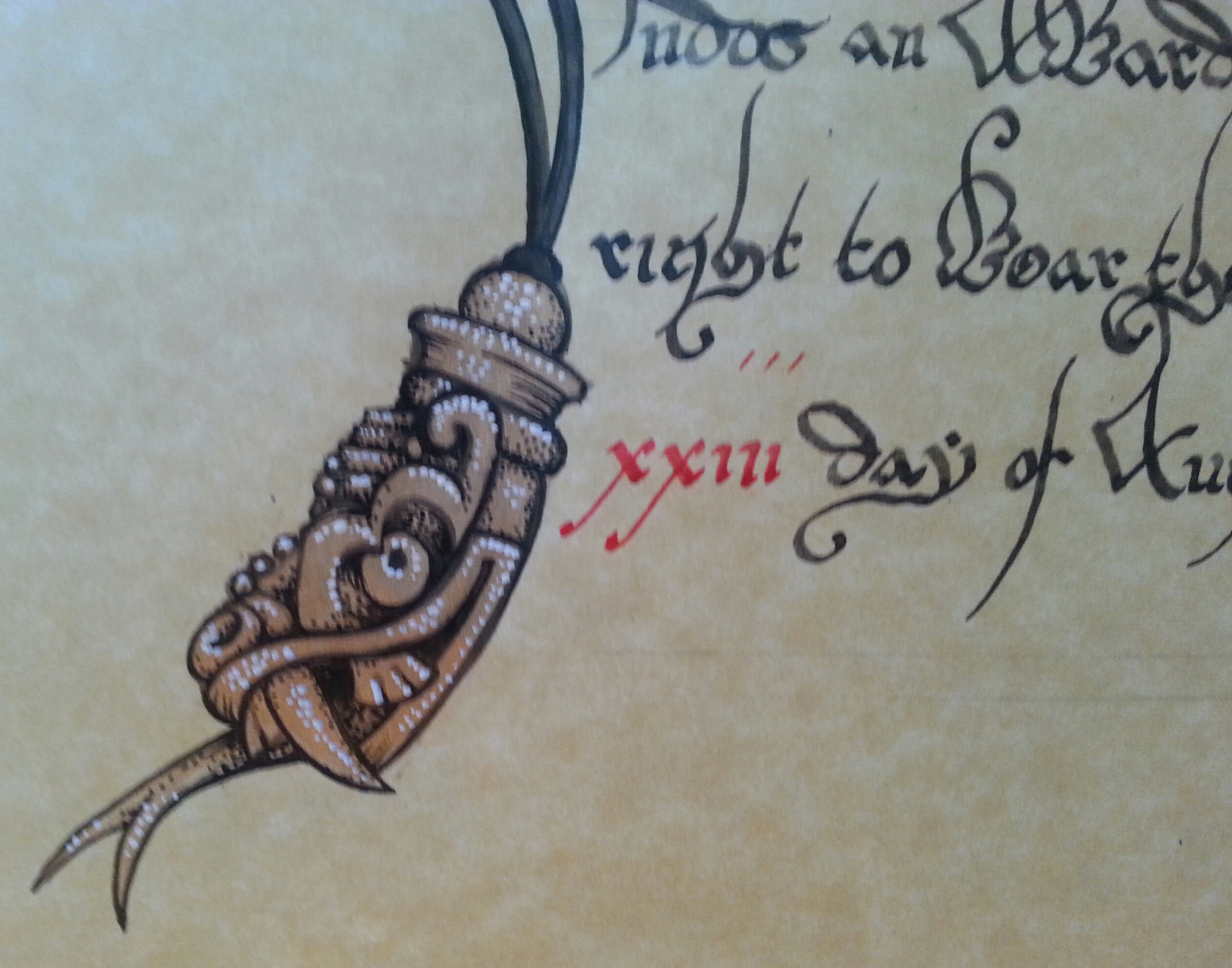 I had a brief window to work on this scroll, and a lot of other things on my plate….but it’s a Sapphire. I haven’t gotten a chance to know Sir Ixtlilxochitl very well, But I do know every word that I have heard spoken of him is of the highest acclaim, not to mention the moving words written by (as I understand it) King Cameron himself. I hope I didn’t flub them up too much.