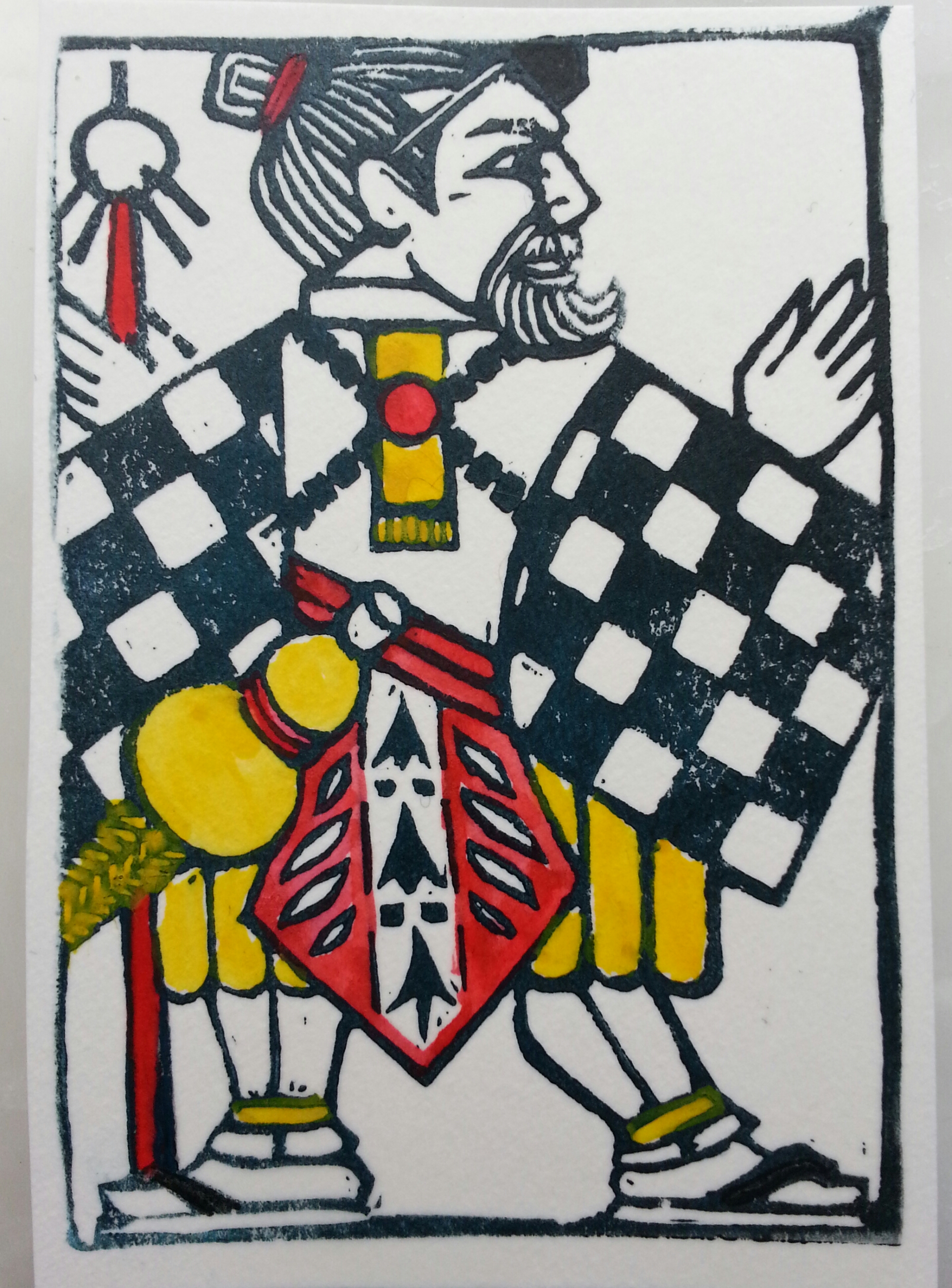 While recovering from surgery, I carved and printed an English pattern pack of cards, intended to date around 1600. One of my objectives was playability, and indeed I can produce quite playable cards. In considering the playing interests of my friends, I realize many may want to play poker (possibly imported from Persia), So I felt the need to produce a joker for the pack.