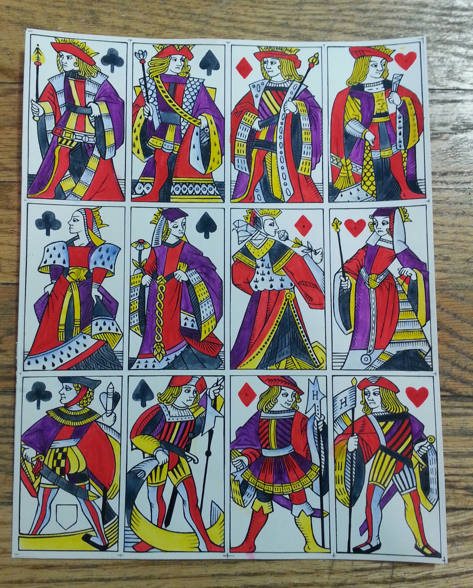 When this pattern was produced, colors included yellow and red (most cards do), as well as black, pale blue-grey, and vivid purple. Although I am researching possible recipes for the pigments, I will likely er on the side of presentation and go with what looks most consistent.