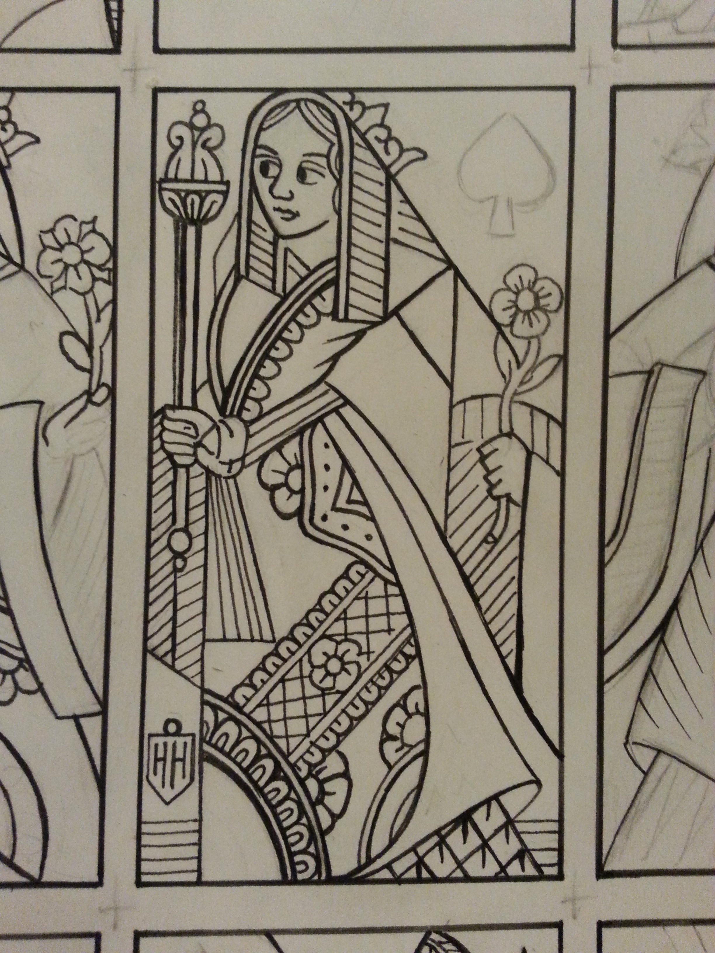 In pursuit of the ancestry of the suicide king, I came across some cards found in Hinderclay, in Suffolk, England. They are the same courts as the ones imported from Rouen, and their proportions and garb suggest much earlier in the sixteenth century. They are painted in red, blue, black, pink, and yellow, and are about 5cm x 9cm.