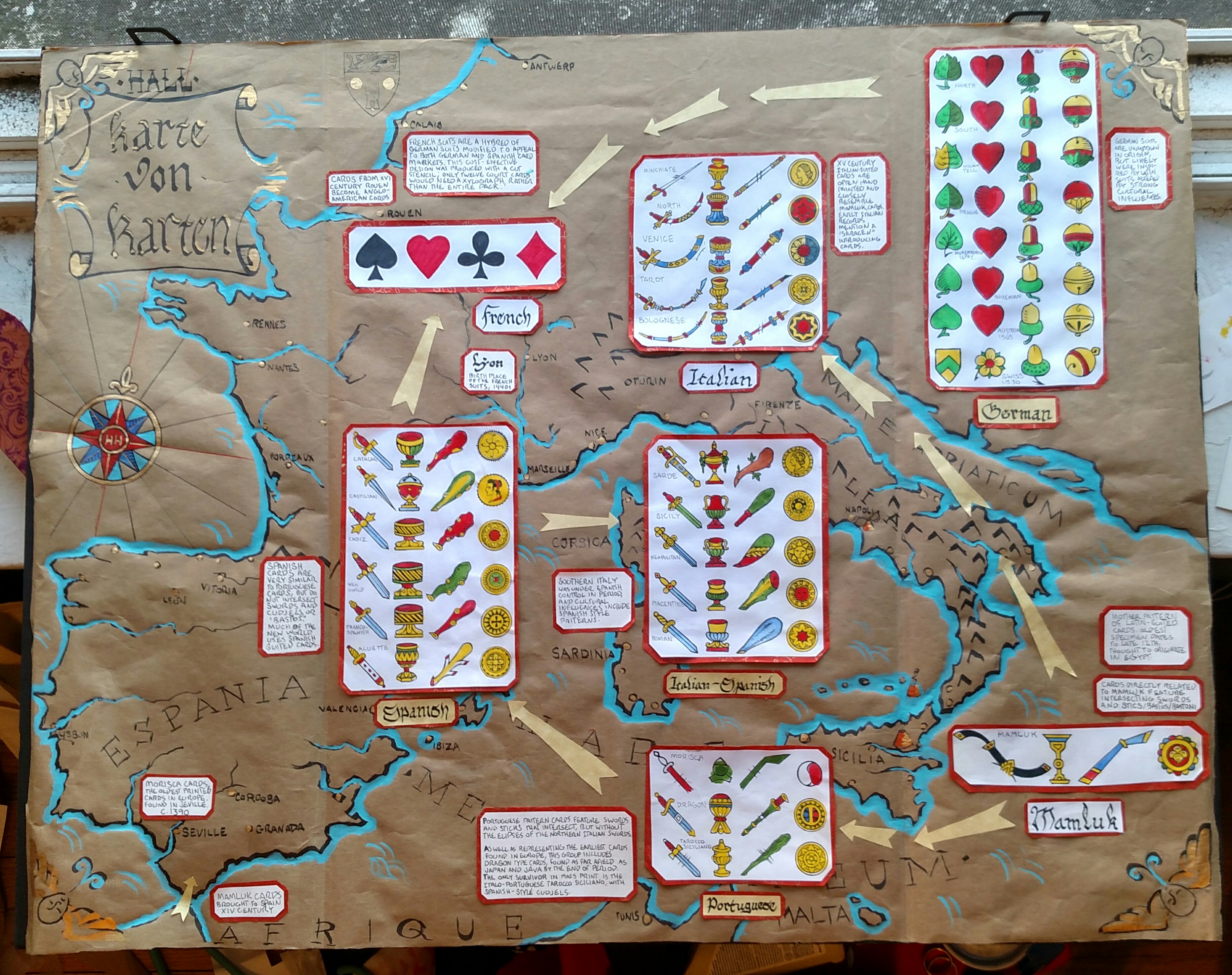 The Tryptych is designed as a visual aid for my playing cards class, in hopes to clarify the origins of the French suited playing cards that appeared in the mid fifteenth century now labeled international. This is an ongoing project, and I will continue to build on it.