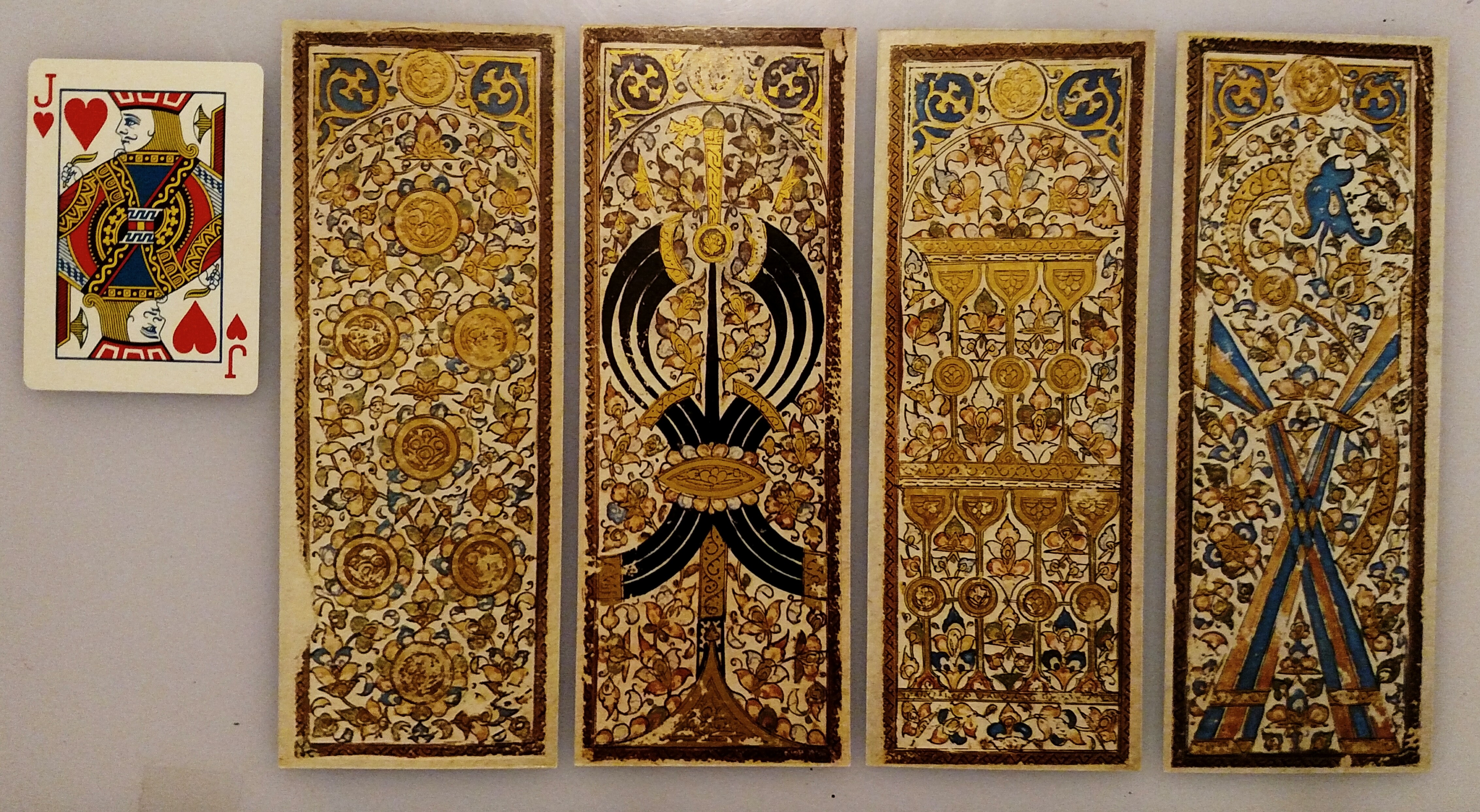 In 1970 an Islamic art collector came across a card fragment, thought to be about half of a Mamluk four of cups. Analysis of the details in the decoration of the fragment date it to late 12th century, or possibly early 13th century.