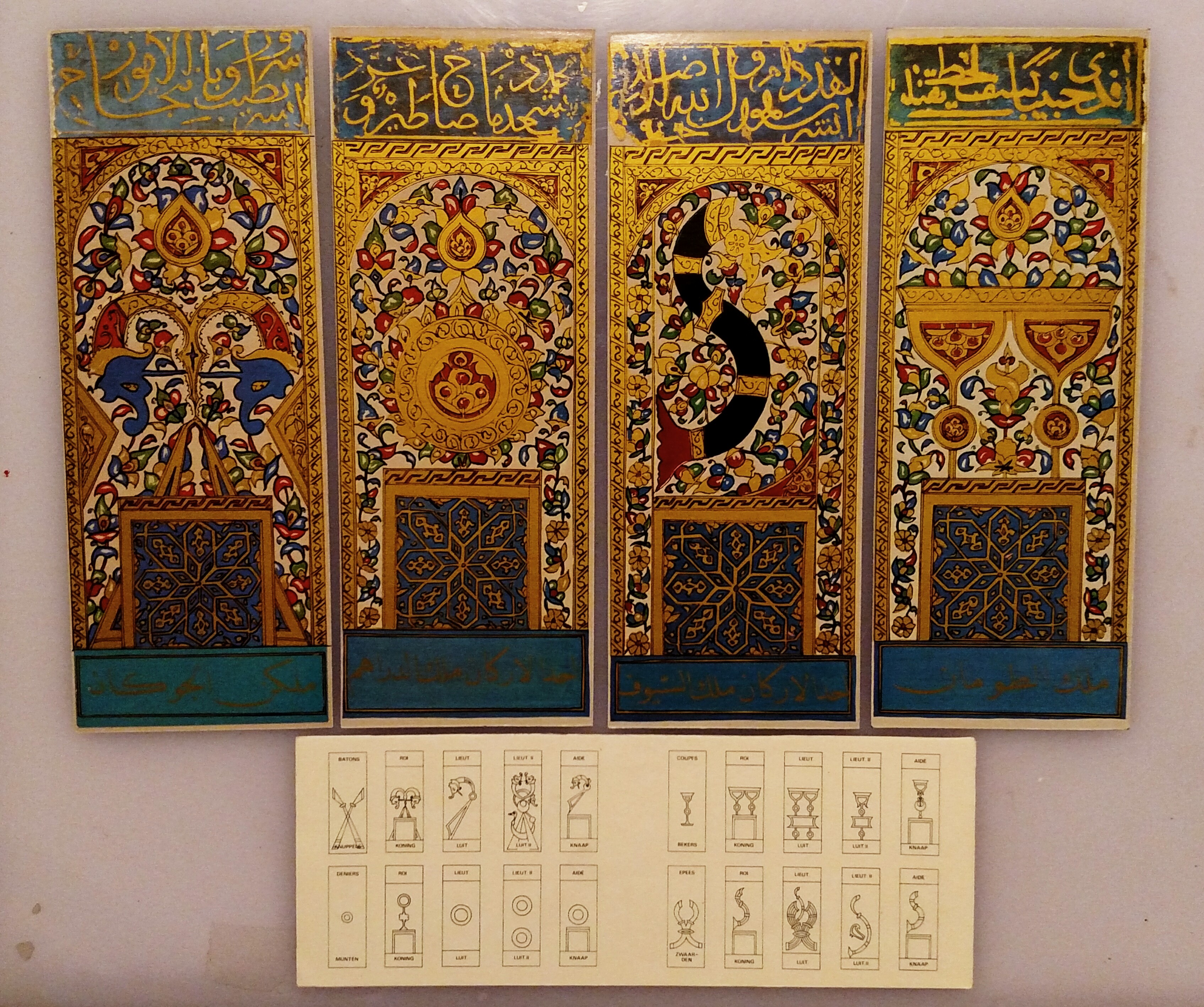 In 1939 L.A. Mayer wrote a treatise on two partial packs. Found in the Topkapi museum, they were probably made in Egypt under Mamluk rule during the fifteenth century. These large, long, heavily embellished cards bear a strong resemblance to Italian illuminated tarot of contemporary times, suggesting cards such as these inspired Europeans to produce their own. The treatise had some other ideas, such as jokers, “helpers,” and four courts that are not as strongly supported by scholars. Skeptics argued that they were not old enough to confirm a parent pack, but could have been influenced by Italian tarot instead.