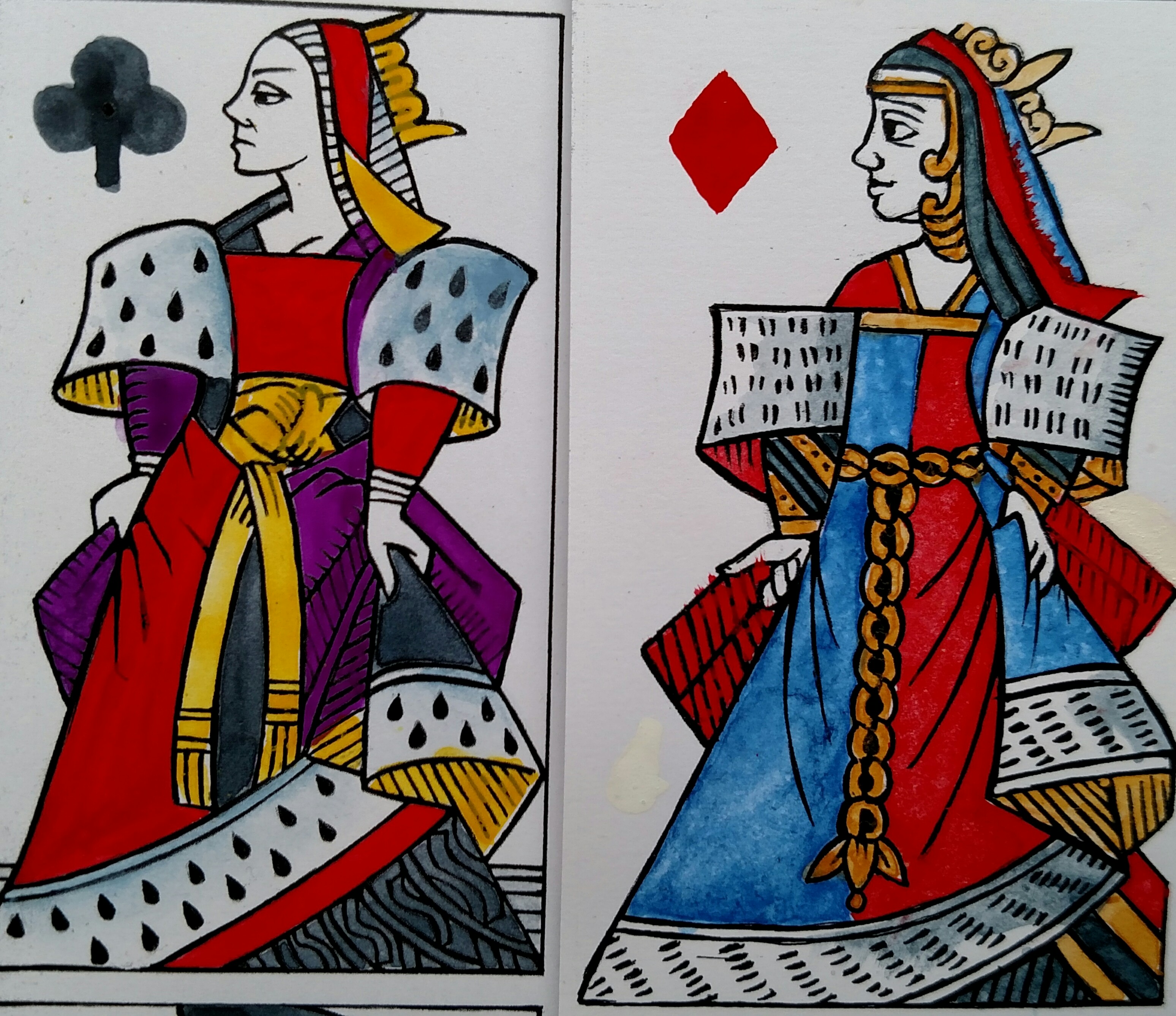 Since it is by hope to use as much care and authenticity as possible with this pattern, it will take some time, and I have no eta yet. Since the Florentine pack is anachronistic (I have no evidence of it prior to 1630, and I’m using an earlier xylograph), I produced a cheater stencil version for patrons who want French suited cards with backs.
