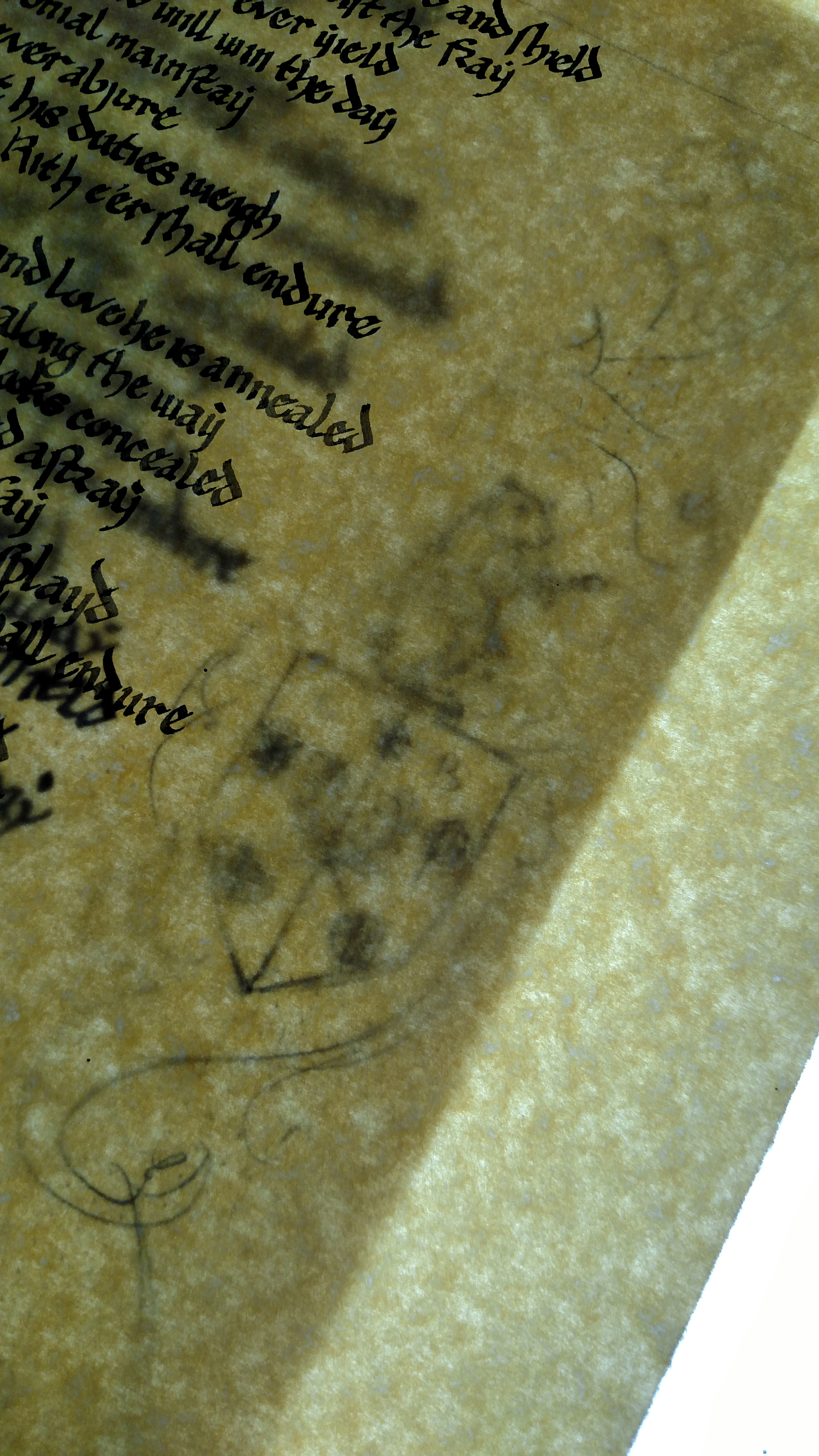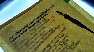 Transferring from draft to scroll paper is as simple as a light table. This allows me to use or enhance the straight lines the dots provide, plus I can see edit notes (mine are usually red) to shift the script, spread it out or compact it, be mindful of illuminations, etc.
