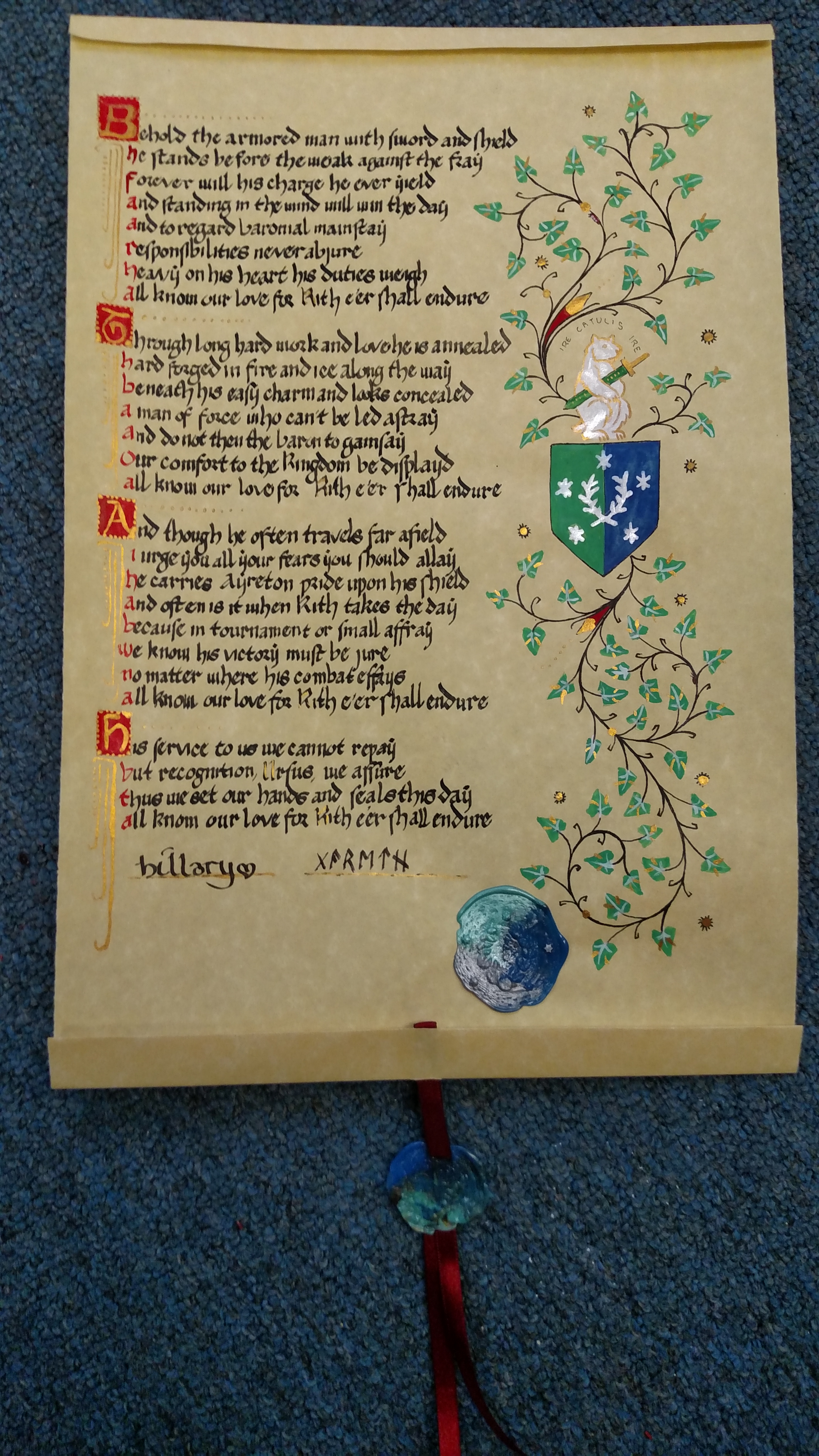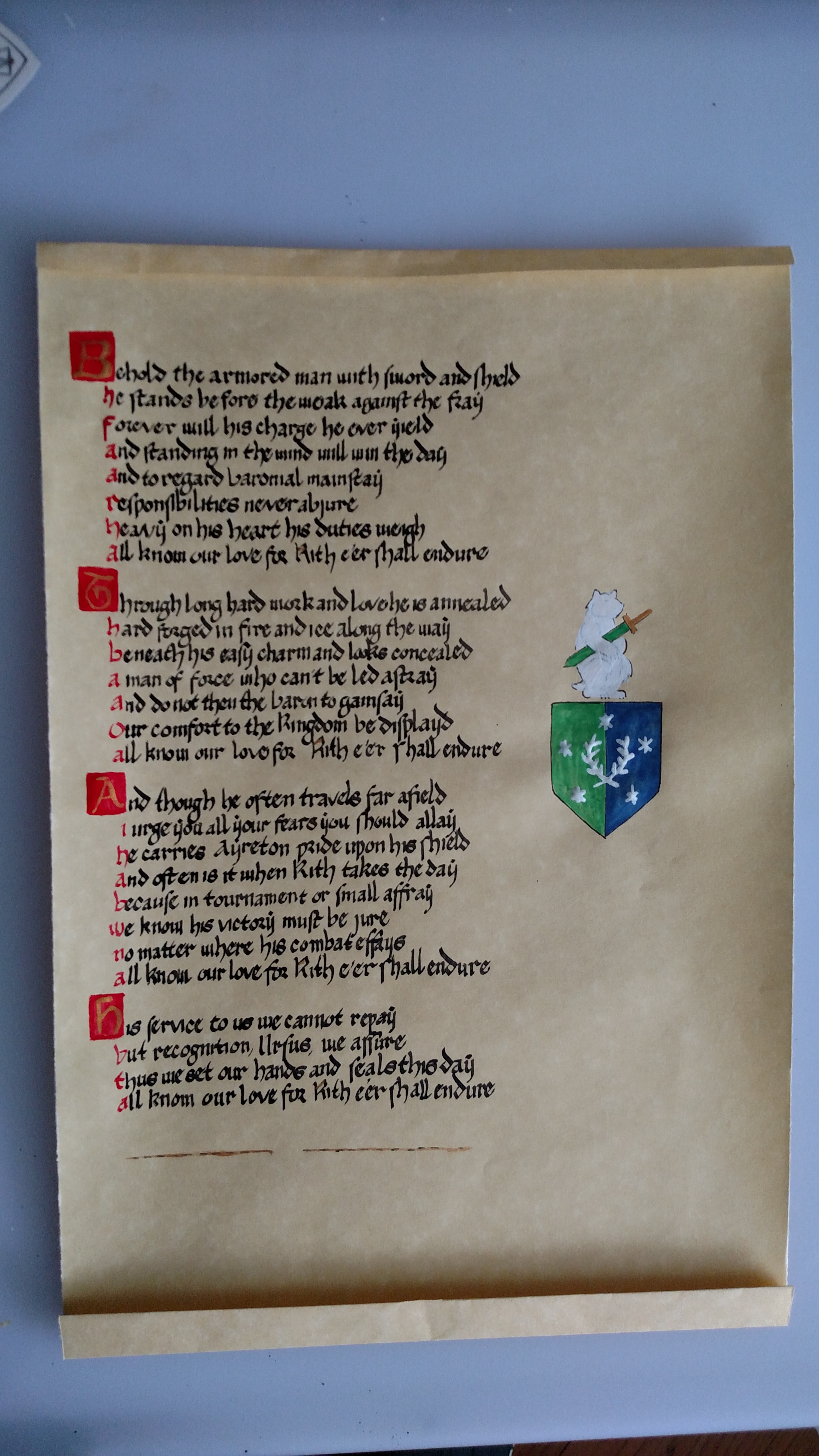 Over the last year I have held the office of Baronial Signet; my job could be described as making sure award scrolls are presented to the Baron and Baroness of Ayreton, so they may sign and seal them for court. At the requests of Masters Phillipe de Leon and Ercc Glason, I am documenting my own scroll production process.