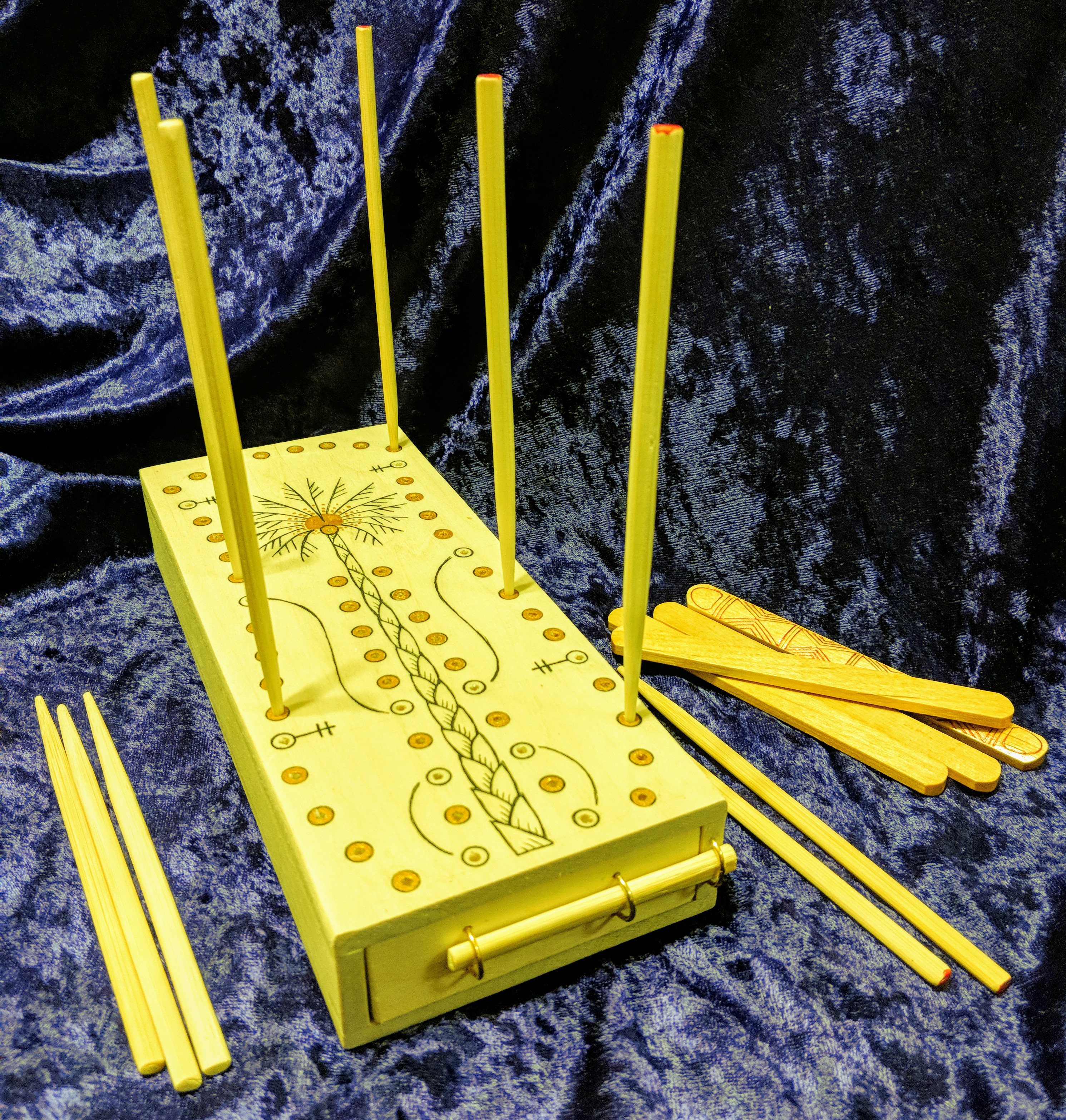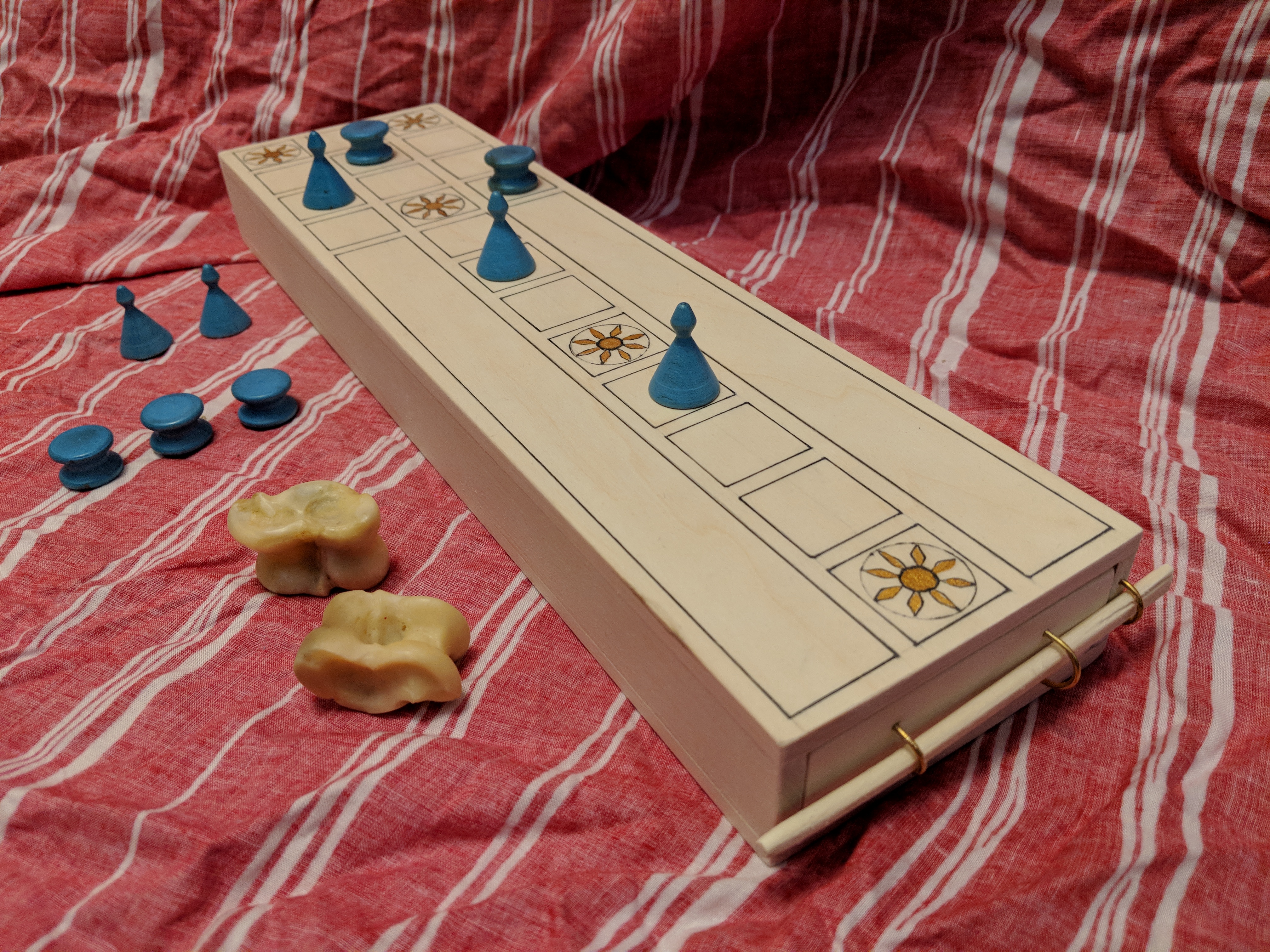 Several of these are incomplete, waiting for ideal components. For example, I hope to replace the chopstick on the Aseb and Hounds & Jackals boxes with a proper papyrus reed.