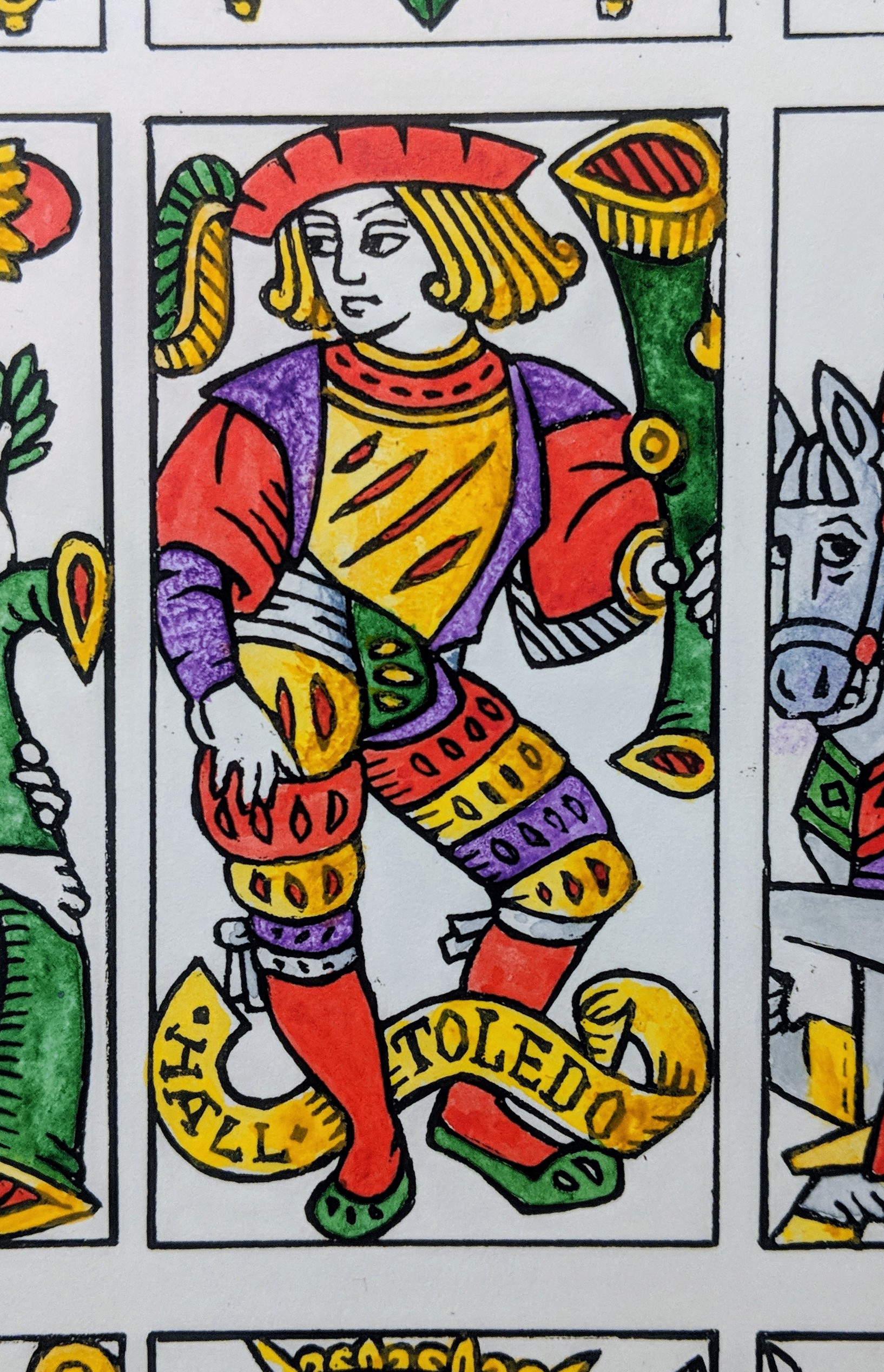For my own production, I want to use a palette similar to the colored sheets, which feature purple on the court cards. Yellow ochre and (synthetic) lead red for sure; purple, green, and grey-blue may need further research.