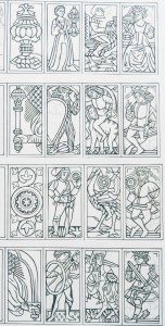 The dimensions of the fragments with fanciful court cards are used (note the sheet with coins and cups is elongated).