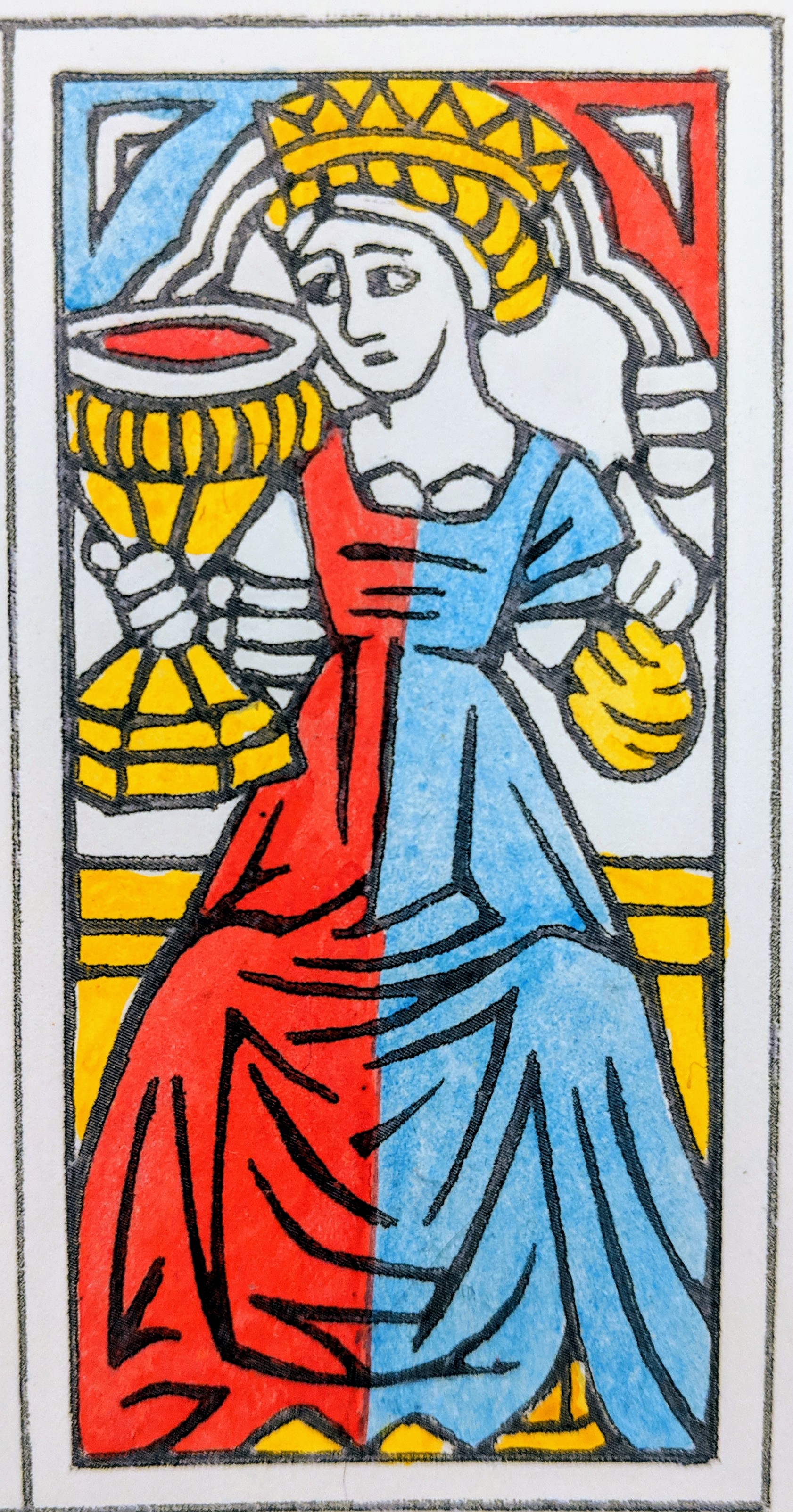 Crude xylograph, but fanciful knights and knaves. The “king” and “jack” of cups are women. Suit sign arrangements (Latin/Italian suits) reflect relation to Portuguese and Mamluk cards.